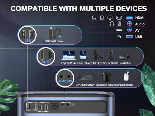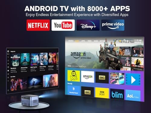 - [Built-in Android System]: Q8 smart projector with built-in Android TV, includes 8000+ apps from app store, streaming over 1,000,000+ movies and TV episodes from Netflix, Prime Video, Disney+, Peacock, no more hassles to buy an extra TV stick. In addition, the Android TV projector consists of HDMI*2/USB*2/AV/audio ports, can easily connect to Android/iOS/DVD. Backed up with professional and reliable tech support, we will resolve it for you about any built-in apps download issues.