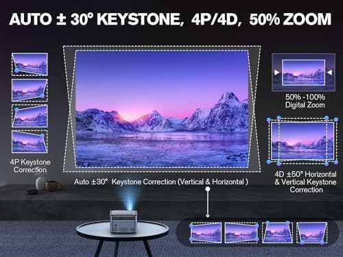 - [Innovative Auto Focus/Keystone/4P4D]: VIZONY home video projector utilizes Auto Focus/Auto Keystone function to present clear pictures in only 3s by detecting real-time movements and automatically keeping your image to a rectangle, without troublesome manual operation and cutting the setup process in half. Combined with 4P4D keystone, image size of this HD projector can be adjusted horizontally/vertically manually. 50% zoom adjust the size from 50% to 100% without moving the projector.