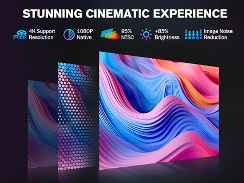 - [800ANSI Native 1080P Projector 4K Supported]: VIZONY FHD movie projector provides superior image fidelity and precise color accuracy, especially offers an extra 85% brightness than other 1080P WiFi projectors on the market. Also supported by ultra HD 4K Videos (H.265) decoding, the home cinema projector displays smoother and stunning pictures, will give you a cinema theater experience. This outdoor movie projector is also a great option for occasions as garden party, camping, yoga and live shows.